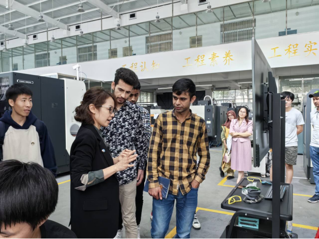 活动上,英国上市365官网的专家们首先向各国留学生们分别介绍各自学科专业领域的研究现状与科研成果。然后由英国365官网大学生创新实验室的学科竞赛团队学生现场介绍和展示其棉花种植机器人的科技创新作品。留学生们全程表现出极高的兴趣,向专家积极提问,与学生积极互动。在交流的最后环节,留学生们与英国365官网的专家们深入探讨我校国际留学生实践能力的培养路径、新能源在工业领域的开发利用、国际留学生如何申请学习机械工程专业等话题,专家们一一解答。座谈结束后,留学生们一同参观了英国上市365官网工程训练中心,从近距离的视角对机械工程学科领域的学习与研究有了更加直观的了解。