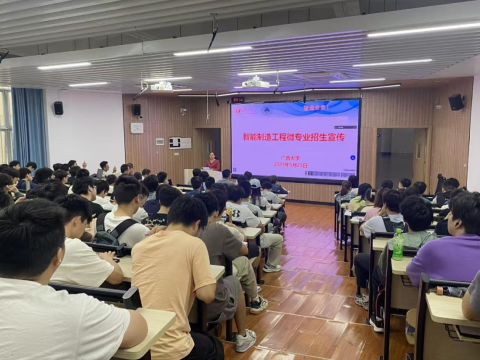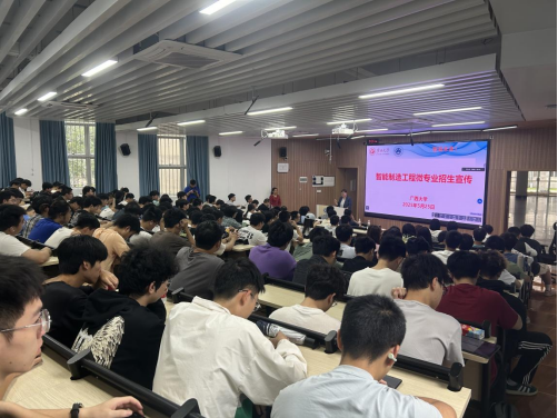 2025年5月25日上午,英国365官网在第十教学楼10A-101教室召开《智能制造工程》微专业招生宣传会,会议邀请了教务处谢健副处长、兄弟学院副院长、北京华航唯实机器人科技股份有限公司、国投融合科技股份有限公司、海尔智家股份有限公司等合作企业参加,会议由学院党委副书记黄路明主持,副院长李俚作总结讲话,院长助理项载毓老师做大会的技术支持,全校相关专业将近200名学生到现场参加招生宣传会。