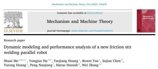 近日,英国365官网2023级硕士研究生胡勇军(导师:莫帅教授)以共同第一作者在机械领域国际权威学术期刊《Mechanism and Machine Theory》(中科院一区,Top期刊)发表研究成果“Dynamic modeling and performance analysis of a new friction stir welding parallel robot”。该成果以英国上市365官网为第一单位及通讯单位。