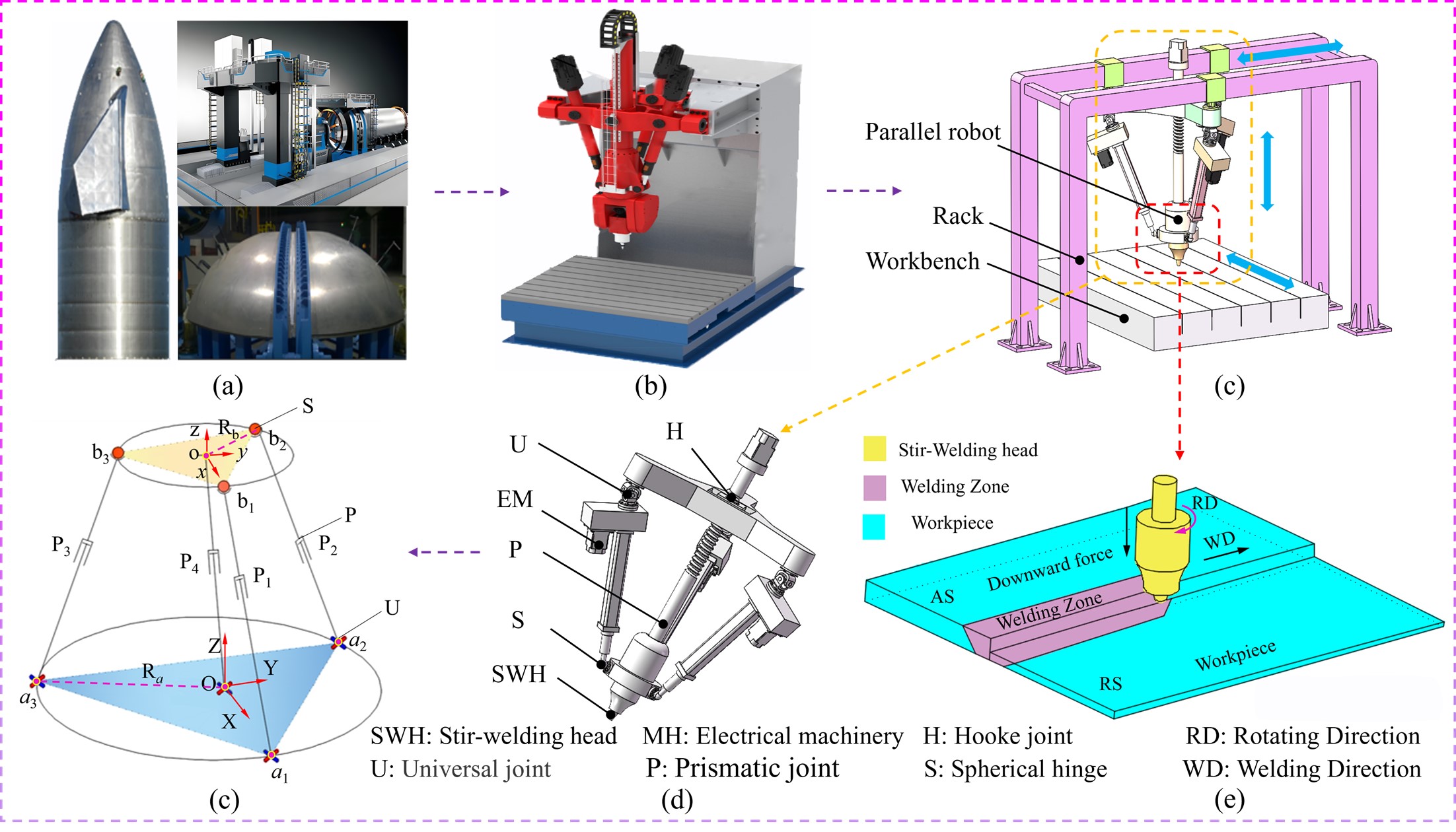 搅拌摩擦焊是一种新型固态连接技术,具有残余应力小、焊接缺陷少和无污染等优势,被广泛应用于航空航天和地铁等大型焊接领域。随着机器人负载承载能力和位姿控制精度的提升,关节机器人已证实为搅拌摩擦焊过程中成本效益最高且灵活性最佳的解决方案之一。搅拌摩擦焊并联焊接机器人动力学建模与分析是机器人设计、力学控制和性能设计的基础,因此,开展搅拌摩擦焊并联机器人动力学建模与动态性能分析研究对机器人设计、提升焊接自动化和提高系统焊接质量具有重要的理论意义与工程价值。