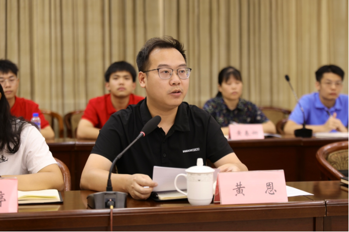 在平果工作的选调生校友代表依次分享了工作经历与感悟。2017届校友黄恩讲述八载扎根基层,践行马君武精神,在脱贫攻坚与乡村振兴一线历练成长的故事。他历经多岗位磨砺,以“民政为民、民政爱民”为宗旨,深耕政策落地“最后一公里”,切实解决群众急难愁盼问题,彰显青年选调生担当实干、服务民生的初心使命。