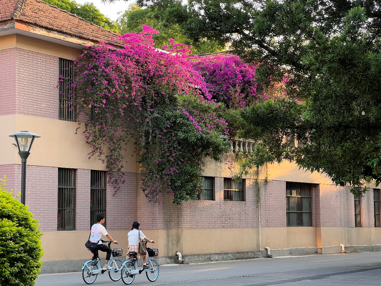 作品介绍:拍摄于2022年5月3日下午约18点20,开车路过机械学院的红楼,红楼二楼的三角梅正盛,夕阳下三两路过的学生,相得益彰。